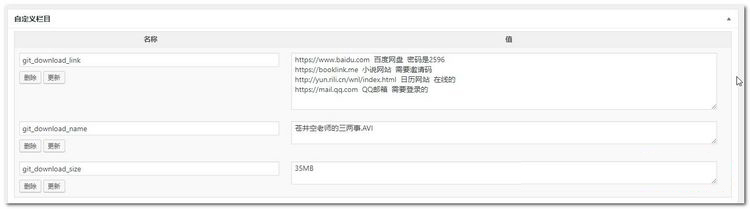 输入 git_download_name,然后右侧输入文件的名字,比如:苍老师的那些事.RMVB,继续输入自定义栏目 git_download_size,然后右侧输入文件的大小,比如:233MB,然后继续输入自定义栏目 git_download_link,然后右侧输入文件的下载链接