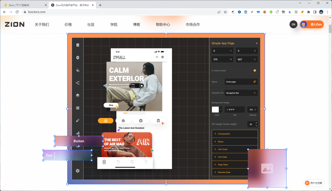 目前「Zion」支持微信小程序、Web页面以及H5的无代码开发,App端的开发,未来也会上线。由于锋哥也是个网站前后端开发者,对于「Zion」的网页低代码开发比较感兴趣。
