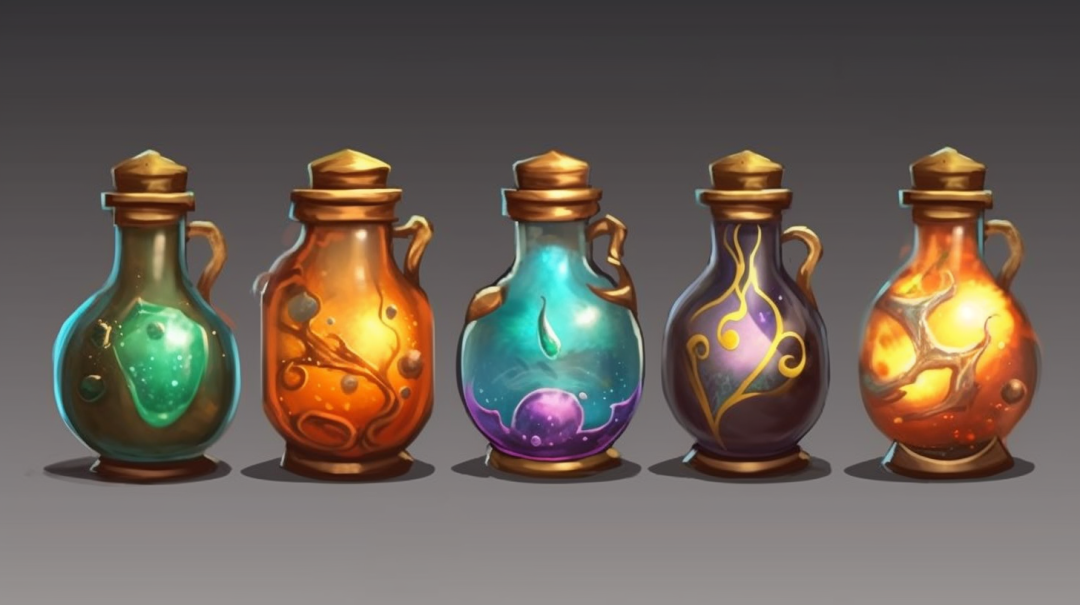 game sheet of different types of enchanted potions, oily, shiny, light background, game icon,blender, style of Hearthstone --ar 16:9 --s 750 --v 5.1