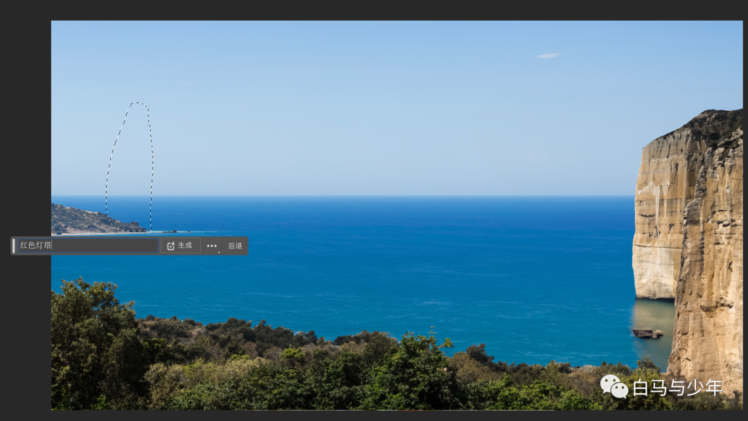 最后,再来一个从零开始创建,使用一张1920x1080的画布,用选区框出左半边,输入“大海,俯瞰,全景”。