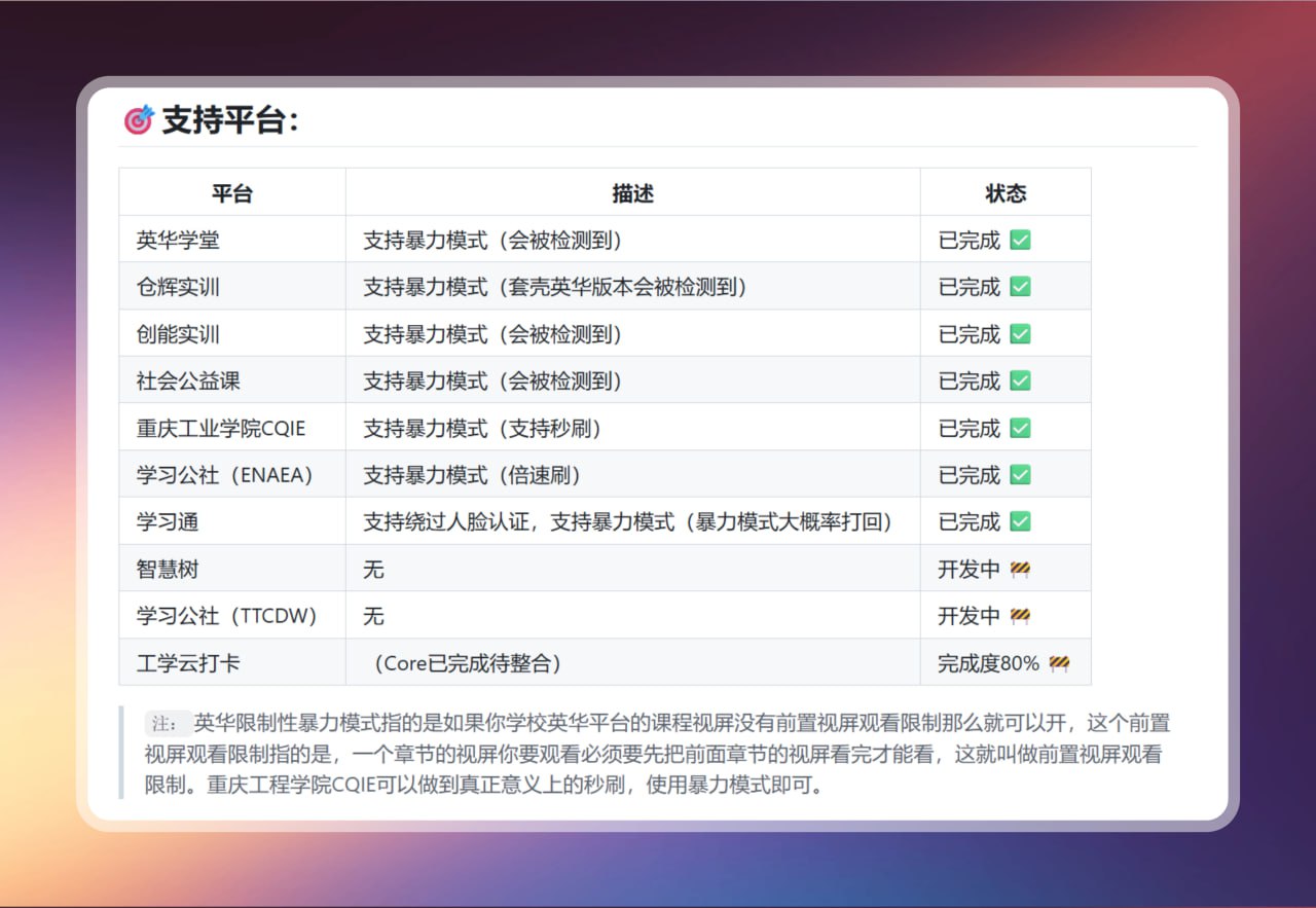 | 部分平台支持暴力模式(无视前置课程学习限制所有视屏同刷) | ✅ |
