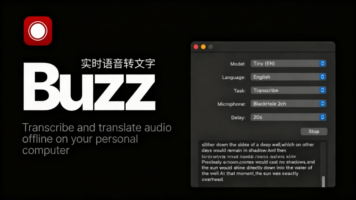 Buzz是一款基于OpenAI Whisper模型打造的开源软件,支持Windows、macOS和Linux系统。它能实时将麦克风捕获的语音转换成文字,亦支持将各类音频、视频文件转录成文字或生成字幕,功能强大且完全离线运行,保护用户隐私。
