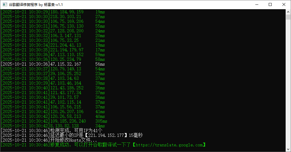 谷歌翻译修复程序是一款由吾爱论坛用户@杨富贵开发的专用于谷歌浏览器的翻译功能修复工具。该软件操作简便,打开后即可自动运行,无需复杂设置。它能够自动检测当前可用且延迟最低的谷歌翻译IP地址,随后自动修改系统的hosts文件,确保浏览器的谷歌翻译功能能够顺利使用。此举有效解决了因IP阻断或hosts文件冲突导致的谷歌翻译无法正常工作的情况。