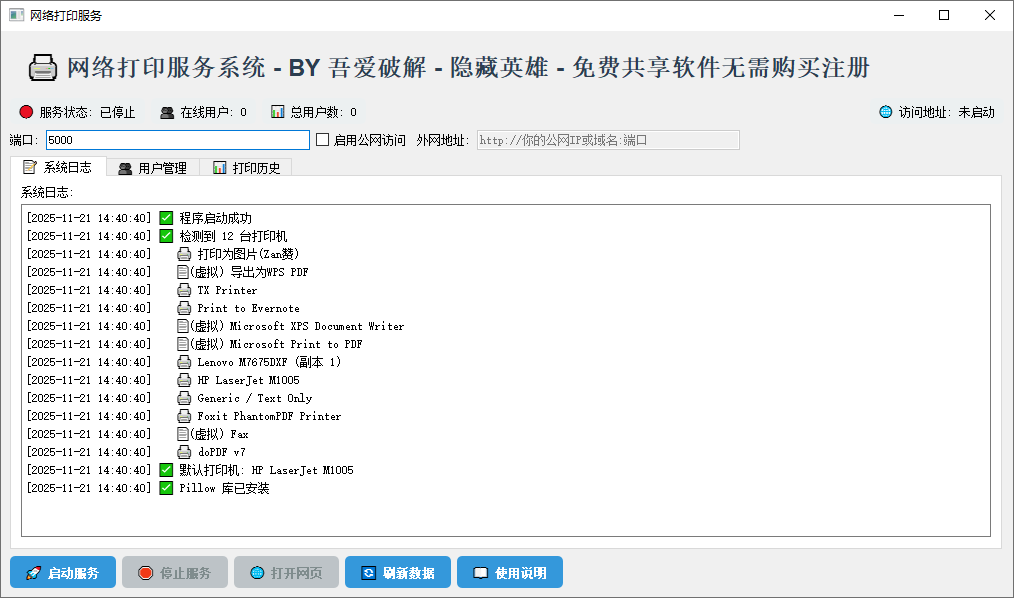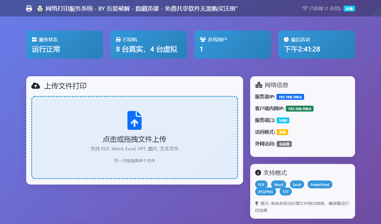 由 吾爱破解@隐藏英雄 开发的 网络打印服务系统,是一款基于 PyQt5 和 Flask 的轻量级工具,可快速将本地打印机设为 网络共享打印服务器。支持多用户通过网页上传文件、选择打印机并远程打印,无需复杂配置,适合家庭或小型办公使用。