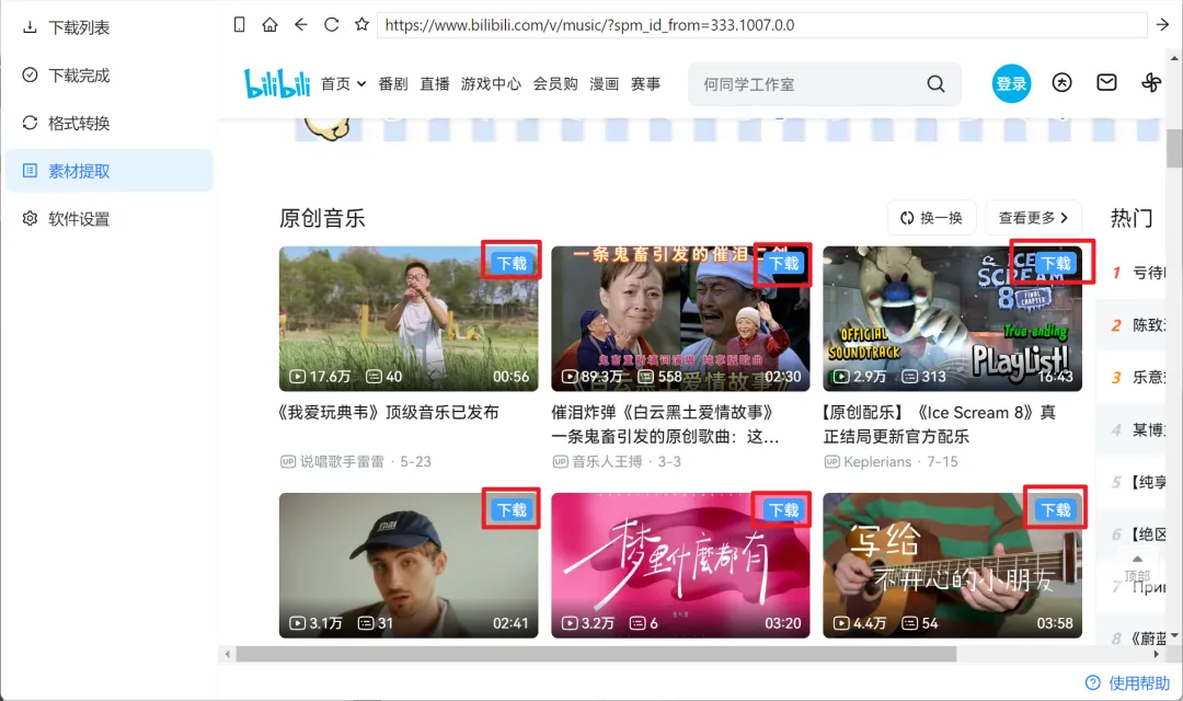 切换到【素材提取】界面,输入目标网页URL,软件自动嗅探视频资源。