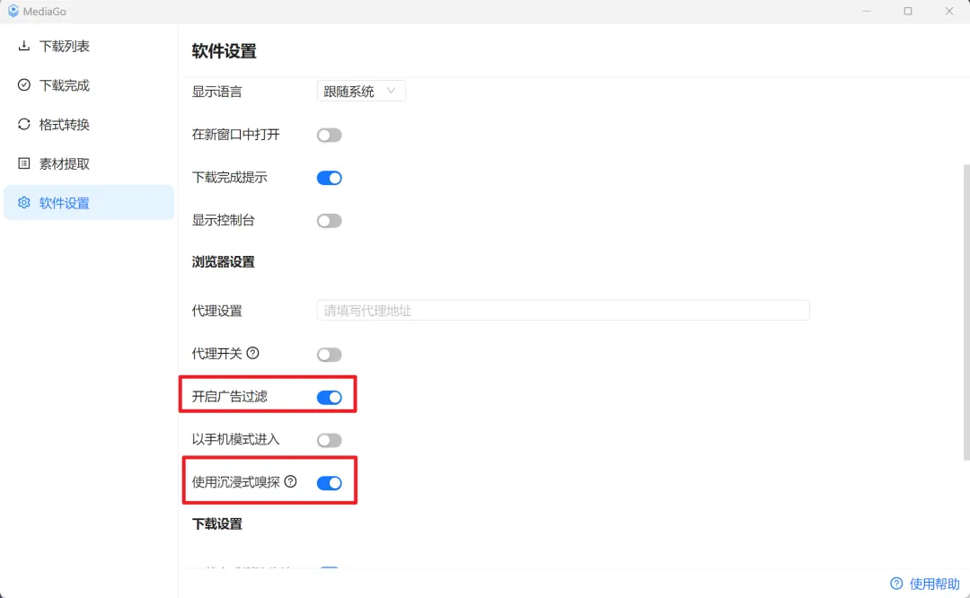 在【软件设置】中调整保存路径,开启“广告过滤”和“沉浸式嗅探”提升体验。