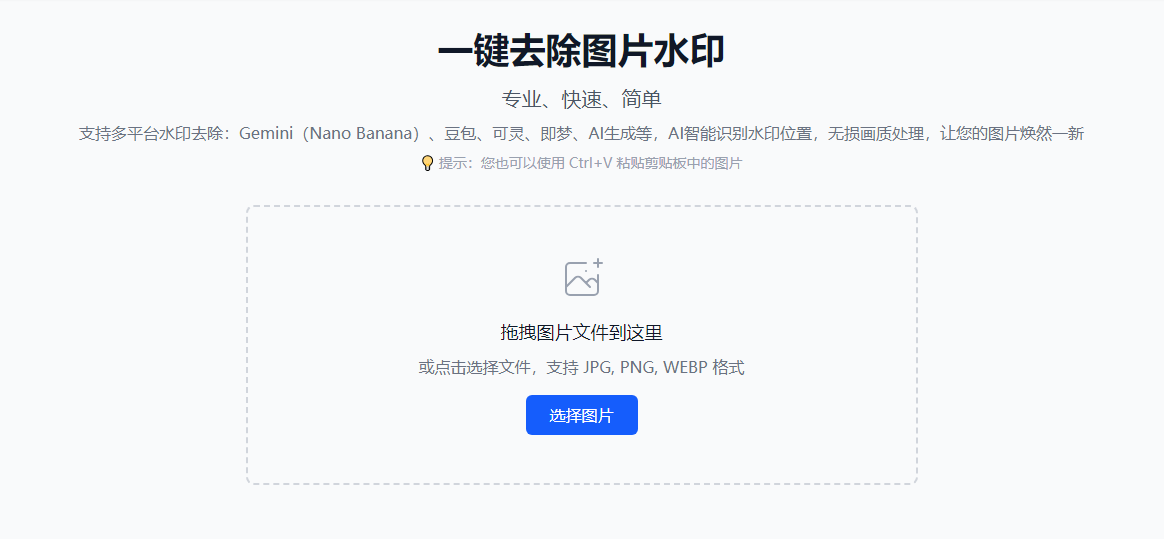 上传图片:点击页面中央的上传区域,或将待处理的图片直接拖入。支持 JPG、PNG、JPEG、WEBP 格式。