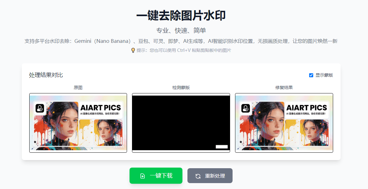 查看与下载:处理完成后,页面会并排展示原图与效果图供您对比。确认满意后,点击下载按钮即可保存无水印的高清图片。