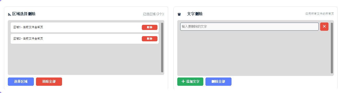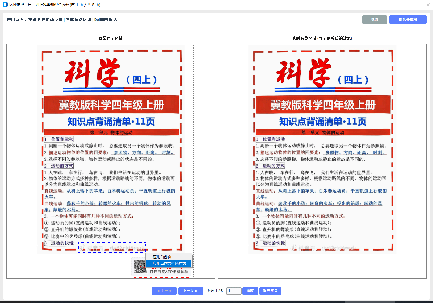 可通过可视化界面,框选PDF页面的任意区域进行删除。支持仅当前页面、所有页面、甚至所有文件的批量操作,灵活高效。