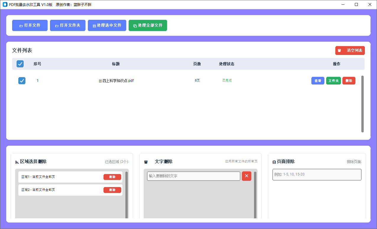 PDF批量去水印工具是一款由吾爱社区开发者@蓝胖子不胖打造的实用软件,专为需要批量去除PDF文件水印的用户设计。支持区域删除和文字删除两种去除水印方式,用户只需框选需要删除的区域或输入水印文字,即可快速实现精准去除,极大提升了工作效率。工具支持批量处理多个PDF文件,可灵活设置页面范围,具备实时预览和详细处理日志功能,确保每一步操作都清晰可控。