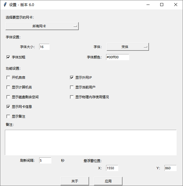 IP信息悬浮显示工具 2026年01月26日16:47:51 发表评论 热度7 ℃ IP信息悬浮显示工具是一款轻量级实用软件,专为需要随时掌握本机网络与系统状态的用户设计。该工具可实时刷新并悬浮显示当前IP信息,让网络环境一目了然。 用户可通过右键菜单进入设置界面,自定义显示字体和颜色,满足个性化需求。 除了IP地址,本工具还能显示计算机名、用户名、磁盘剩余空间、内存占用等关键信息,帮助用户全面了解电脑当前状态。 同时,支持关闭网卡信息显示,并可添加自定义备注,方便记录和区分不同用途的电脑。 文件下载 资源名称:IP信息悬浮显示工具 应用平台:Windows 资源版本:v6.0 资源大小:9.6M 下载地址