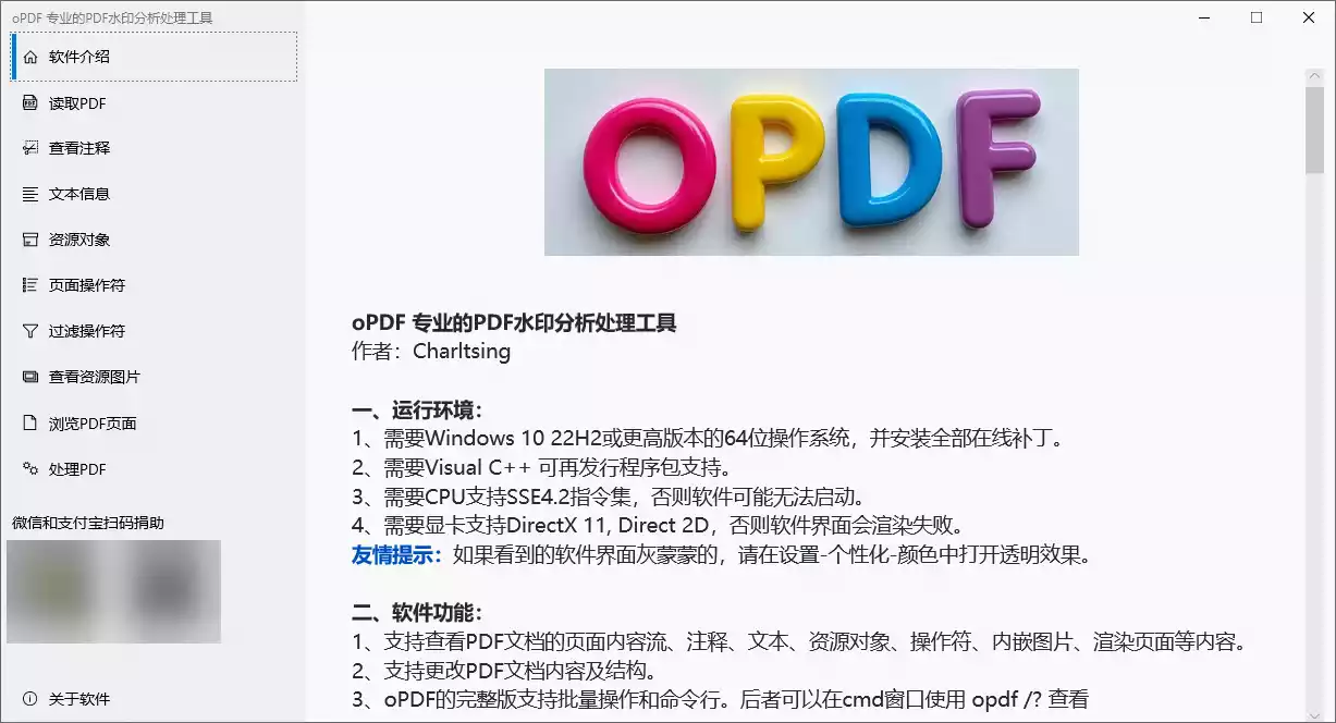 oPDF v2.0是一个无损去除PDF水印的工具,它是PDFCommander的升级版。后者因技术缺陷,不再更新。