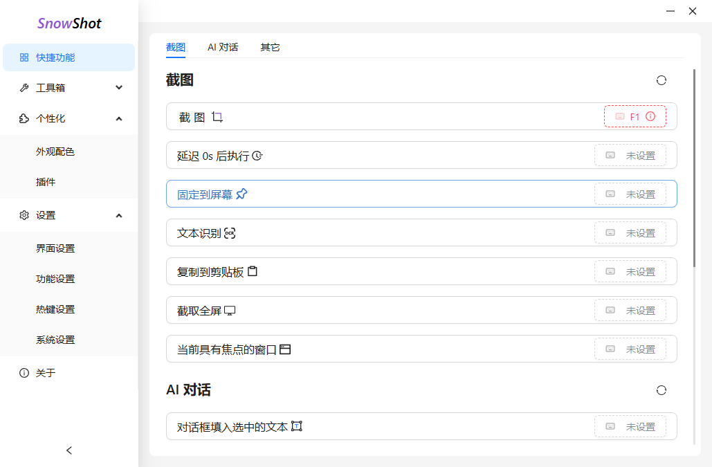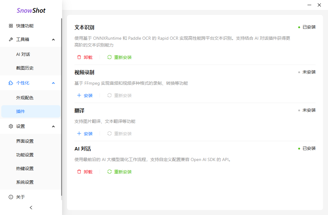 内置插件市场,一键安装文字识别(OCR)、视频录制、翻译、AI对话等实用功能,软件功能自由拓展。