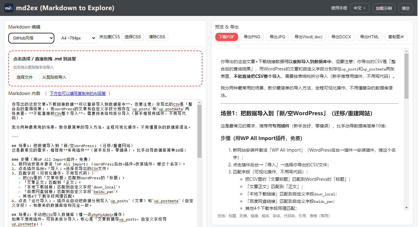 md2ex(Markdown to Explore)是一款旨在将AI聊天记录(如ChatGPT、豆包等生成的内容)转换为正式文档的在线工具。它解决了从网页复制粘贴到Word时格式丢失、排版混乱的痛点。其核心功能是 “所见即所得” 的Markdown渲染与多格式导出。