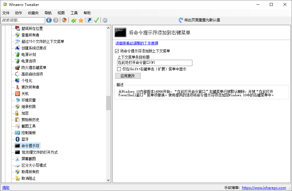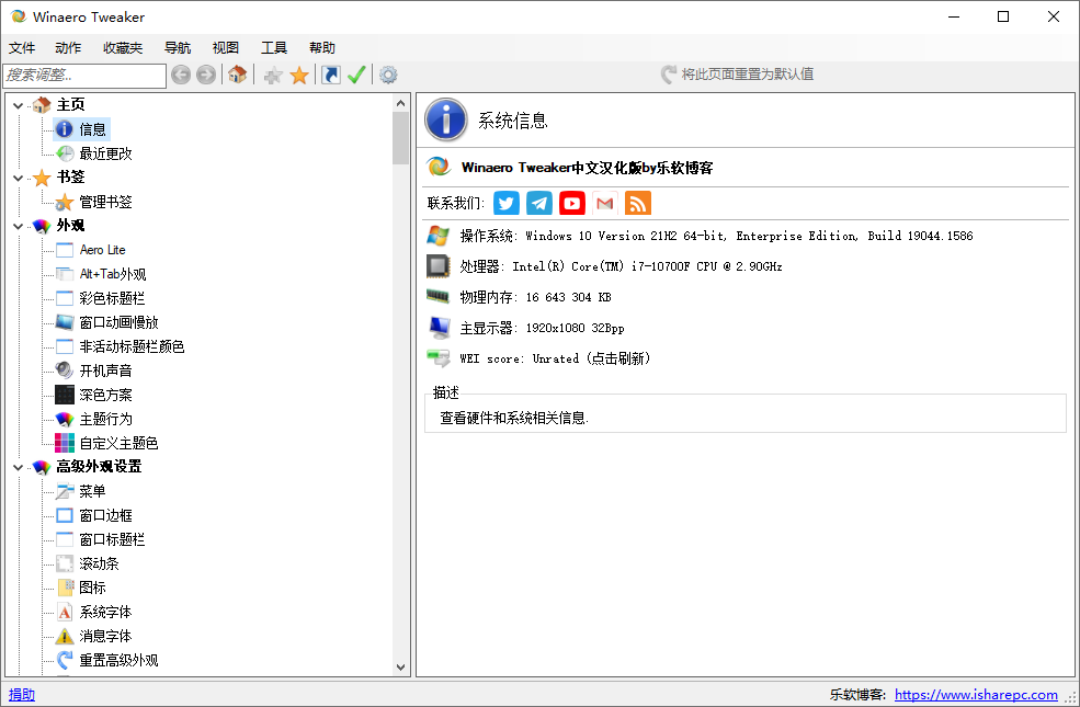 下载安装Winaero Tweaker,启动软件后即可看到简洁的功能列表。