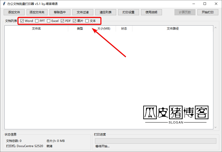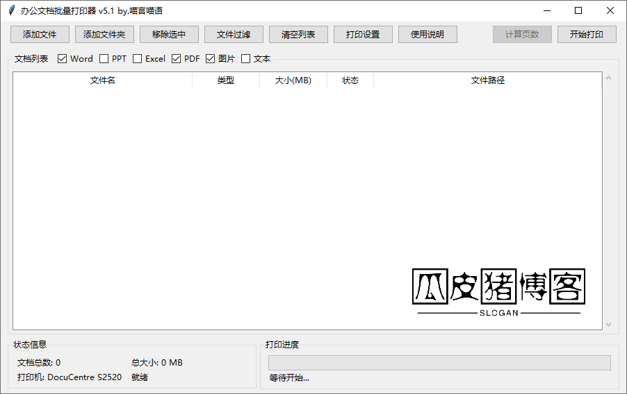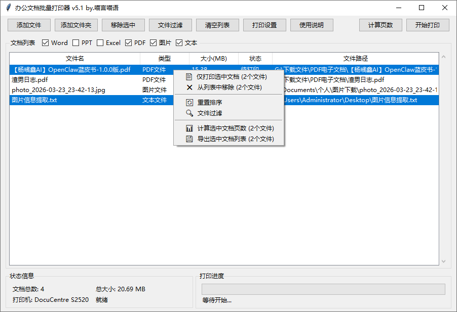 办公文档批量打印器-多格式文件一键批量打印 2026年03月27日10:46:38 发表评论 热度10 ℃ 使用说明 目录 办公文档批量打印器是一款由吾爱破解论坛@喵言喵语推出的小巧实用软件。它支持一次性添加多种格式的办公文件,包括Word、PPT、Excel、PDF、图片和文本等,并批量打印。 使用说明 下载后直接运行办公文档批量打印器,在「文档列表」中勾选要打印的文件格式,否则无法添加文件。 支持拖拽或点击添加按钮导入文件 添加完文件之后可以点击「打印设置」统一设置打印机、纸张尺寸、页面方向、打印数量、单双面、黑白或彩色等。 设置完之后,回到主界面点击「开始打印」即可。 文件下载 资源名称:办公文档批量打印器-多格式文件一键批量打印 应用平台:Windows 资源版本:v5.1 资源大小:32.3M 下载地址