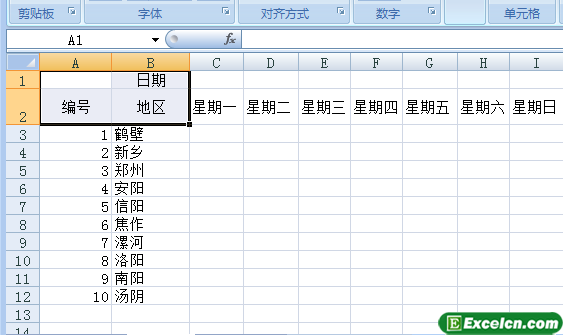 1、图5的示例表需要制作一个多条斜线表头,我们首先把左上角编号、地区、时间那一块选中合并单元格了。