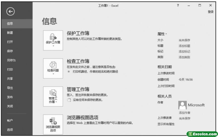 单击【文件】选项卡后,会显示一些基本命令,包括【信息】、【新建】、【打开】、【保存】、【另存为】、【打印】、【共享】、【导出】、【关闭】、【账户】、【选项】等命令,如下图所示。