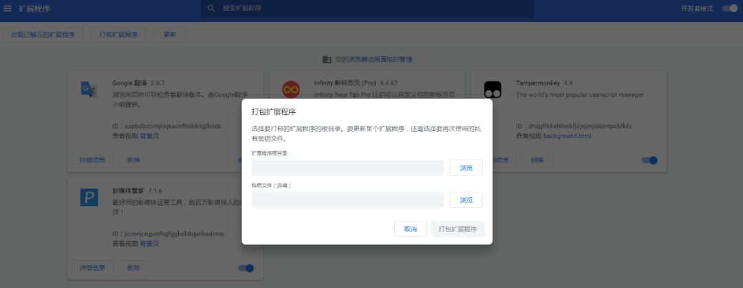 再次进入 Chrome://extensions/页面,打开开发者模式,并点击【打包扩展程序】。