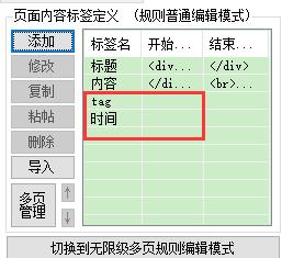 3.在火车头采集器中,我们在第二步“采集内容规则”设置时,如果要设定发布时间,则新增标签“时间”,如果要定义文章Tag标签,则新增标签“tag”。